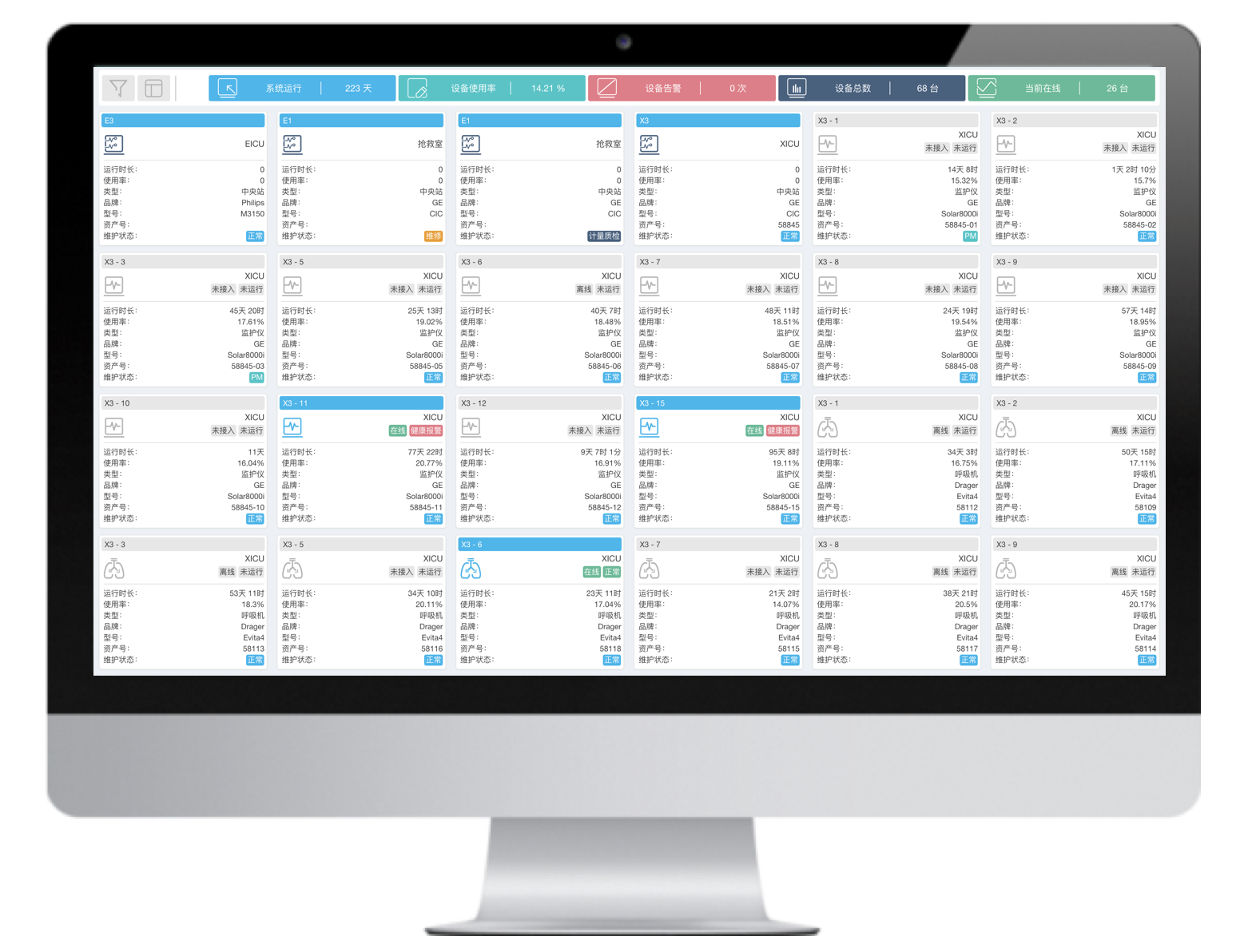 實時顯示數據引擎狀態(tài),數據趨勢、設備使用概況、科室品牌設分布和使用概況、設備運維狀態(tài)、最新運行事件的可視化數據大屏